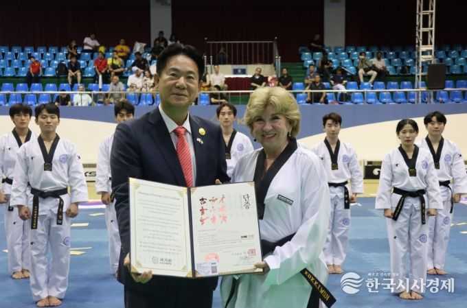마지막으로 이동섭 국기원장이 제인 넬슨 국무장관에게 태권도 보급에 공로한 기여를 인정, 명예 5단증을 수여하고 태권도복과 띠를 증정했다.