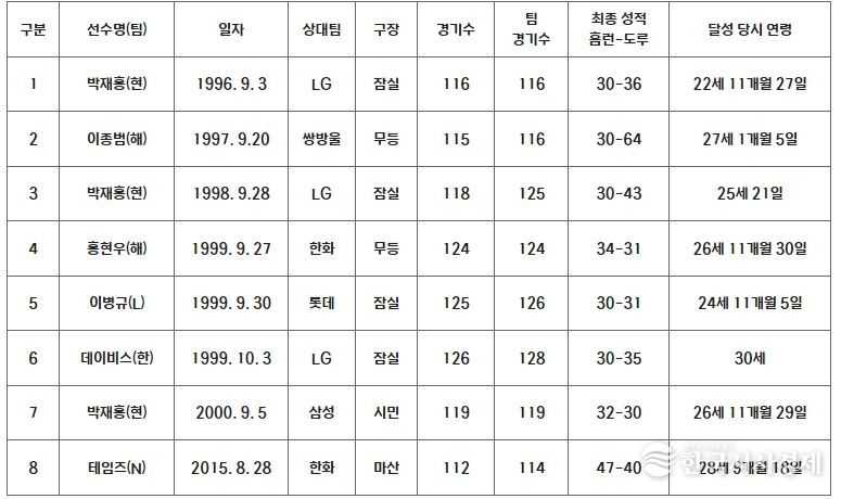 특히 30일(화) 기준 20세 9개월 28일의 나이인 김도영이 이번 시즌 30-30을 달성할 시, 종전 최연소 기록이었던 박재홍(전 현대)의 22세 11개월 27일을 약 2년 앞당기며 최연소 기록을 세우게 된다.