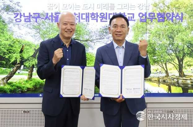 한국시사경제 경제팀 | 꿈이 모이는 도시, 미래를 그리는 강남구가 12일 구청에서 서울벤처대학원대학교와 ‘취‧창업 인프라 확산 및 글로벌 기업가 양성을 위한 업무 협약’을 체결했다.