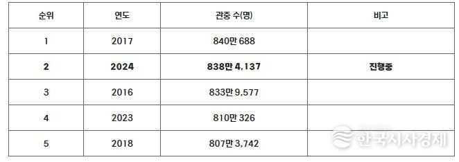 한국시사경제 스포츠팀 | 2024 신한 SOL뱅크 KBO 리그가 기존 최다 관중인 2017시즌의 840만 688명을 넘어 역대 최다 관중 달성을 앞두고 있다.