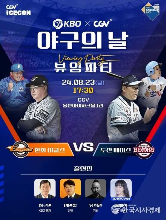 한국시사경제 스포츠팀 | KBO는 오는 8월 23일(금) ‘야구의 날’을 기념하기 위하여 CJ CGV와 함께 '2024 KBO X CGV 야구의 날 뷰잉 파티(VIEWING PARTY)'를 개최한다. 이번 야구의 날 뷰잉 파티 행사는 CGV용산아이파크몰 1관에서 열린다.
