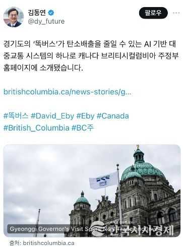 김동연 경기도지사는 22일 자신의 누리소통망(SNS)에 “경기도의 ‘똑버스’가 탄소배출을 줄일 수 있는 AI기반 대중교통 시스템의 하나로 캐나다 브리티시컬럼비아 주정부 홈페이지에 소개됐다”며 링크를 공유했다.