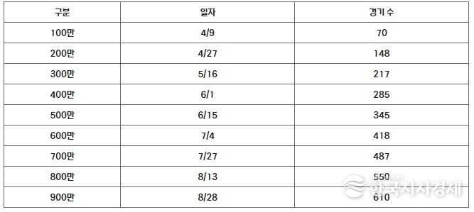 SSG도 95만 1,776명을 동원해 100만 관중을 눈앞에 두고 있으며, 롯데도 홈 56경기를 치른 현재 93만 5,869명을 기록하고 있어 100만 관중 돌파가 유력해 6개 구단이 100만 관중을 넘길 수 있을 전망이다.
