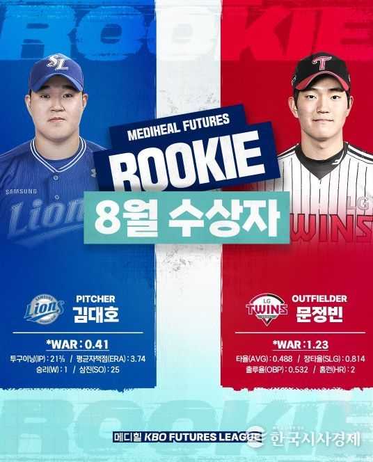 한국시사경제 스포츠팀 | 2024 KBO 퓨처스리그의 8월은 육성선수들의 활약이 돋보였다. 8월 메디힐 퓨처스 루키상의 수상자로 투수 부문에 삼성 김대호, 타자 부문에 LG 문정빈이 각각 선정됐다.