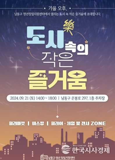 한국시사경제 경제팀 | 인천시 남동구 청년창업지원센터는 오는 21일 오후 2~6시 논현LH16단지 주차장에서 25개 청년창업기업이 참여하는 ‘청년창업기획전, 도시:락(樂)’을 개최한다고 20일 밝혔다.