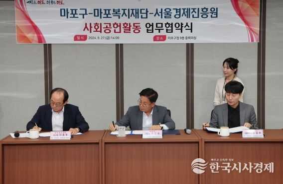 한국시사경제 경제팀 | 마포구는 9월 27일 오후, 마포구청 중회의실에서 마포복지재단, 서울경제진흥원과 사회공헌 활동 사업을 위한 3자 협약을 맺었다.