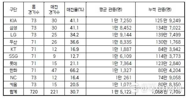 정규시즌 1,2위를 차지한 KIA와 삼성도 엄청난 열기로 30번의 매진으로 이어지며 41.1% 매진율을 기록했다. 두산이 26회, LG가 25회 매진으로 총 5개 구단이 25회 이상, 30% 이상의 매진 경기를 만들어냈다. 뒤이어 롯데, 키움 15회, KT, NC 12회, SSG 9회 매진을 기록했다.
