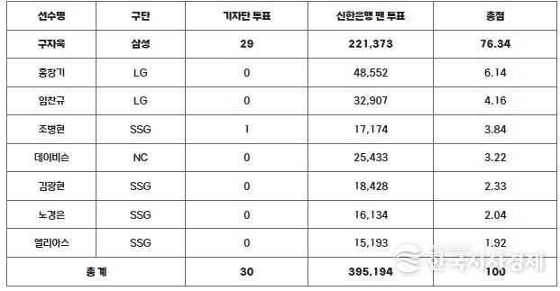 기자단 투표 29표, 팬 투표 221,373표, 총점 76.34점
