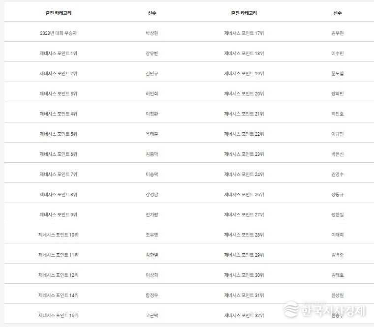 현재 7,218.89포인트로 제네시스 포인트 1위에 자리하고 있는 장유빈(22.신한금융그룹)을 필두로 2위 김민규(23.CJ), 3위 허인회(37.금강주택), 4위 이정환(33.우리금융그룹), 5위 옥태훈(26.금강주택), 6위 김홍택(31.볼빅), 7위 이승택(29), 8위 강경남(41.대선주조), 9위 전가람(29), 10위 조우영(23.우리금융그룹) 등 제네시스 포인트 TOP10을 비롯해 31위 윤상필(26.아르테스힐), 32위 한승수(38.하나금융그룹)까지 참가자 명단에 포함됐다.