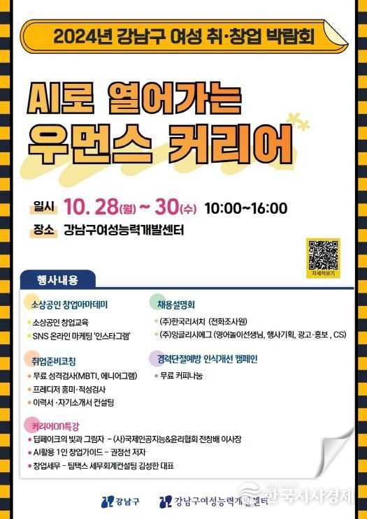 한국시사경제 경제팀 | 꿈이 모이는 도시, 미래를 그리는 강남구가 오는 10월 28일부터 30일까지 강남구여성능력개발센터에서 제14회 강남구 여성 취·창업 박람회 ‘AI로 열어가는 우먼스 커리어’를 개최한다.