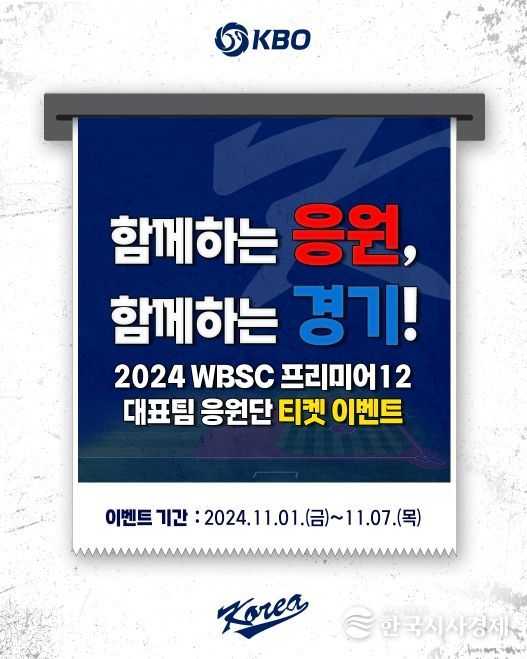 한국시사경제 스포츠팀 | KBO는 11월 13일(수)부터 18일(월)까지 대만에서 열리는 2024 WBSC 프리미어12 1라운드 경기를 맞아 입장권 증정 이벤트를 진행한다. 이번 입장권 증정 이벤트는 대한민국 야구대표팀의 선전을 기원하며 대만 현지에서 직접 응원할 기회를 제공하기 위해 마련했다.