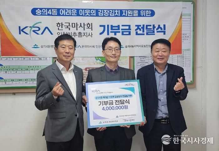 한국시사경제 경제팀 | 한국마사회 인천 미추홀지사는 4일 숭의4동 지역사회보장협의체에 ‘겨우내 행복한 김장 김치 지원사업’을 위한 기부금 400만 원을 전달했다.