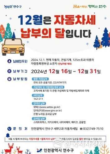 한국시사경제 경제팀 | 연수구는 2024년도 12월 정기분 자동차세 179억여 원(11만여 건)을 부과했다.