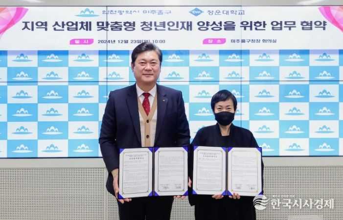 한국시사경제 경제팀 | 인천 미추홀구는 23일 구청장실에서 박두경 청운대학교 취·창업혁신원장과 함께 ‘지역 산업체 맞춤형 청년 인재 양성을 위한 업무 협약’을 체결했다.