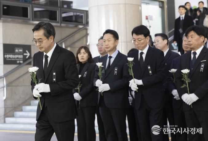 한국시사경제 이정이 기자 | 김동연 경기도지사가 31일 김성중 행정1부지사, 고영인 경제부지사, 조선호 소방재난본부장, 주요 실국장들과 수원역에 마련된 제주항공 여객기 사고 희생자 합동분향소를 방문해 희생자들을 추도했다.