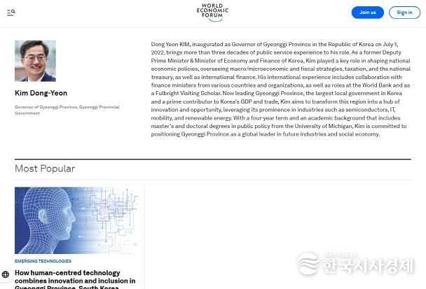 한편, 다보스포럼은 특별세션을 통해 김 지사에 대한 소개 페이지를 만들어 제공하고 있다. 다보스포럼은 “김동연 지사는 30년 이상의 공직 경험을 바탕으로 경기도를 이끌고 있다. 대한민국 경제부총리 겸 기획재정부 장관을 역임했으며 국가 경제 정책 수립에 핵심적인 역할을 수행했고, 거시·미시경제, 재정 전략, 조세, 국가 재정 및 국제 금융 등을 총괄했다. 대한민국 GDP와 무역에서 중요한 역할을 하는 최대 지방정부인 경기도를 이끌며, 반도체, IT, 모빌리티, 재생에너지와 같은 첨단산업에서의 경기도의 입지를 활용해 이 지역을 혁신과 기회의 중심지로 탈바꿈시키고자 한다”고 소개했다.