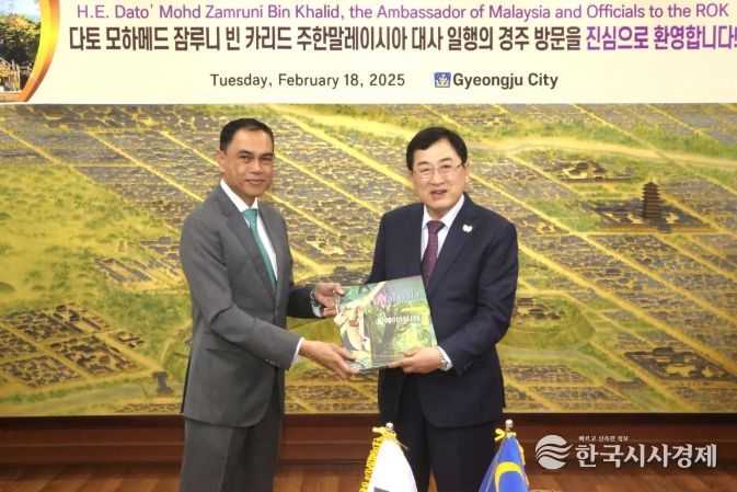 한국시사경제 해외팀 | 주낙영 경주시장이 다토 모하메드 잠루니 빈 카리드(Dato' Mohd Zamruni Bin Khalid) 주한말레이시아 대사를 18일 시청에서 접견하고, 양국 간 미래지향적 교류 및 협력 방안에 대해 의견을 나눴다.