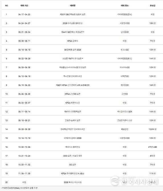 한국시사경제 스포츠팀 | ㈜한국프로골프투어(대표이사 김원섭, KPGT)가 20일 2025 시즌 KPGA 투어 일정을 발표했다.