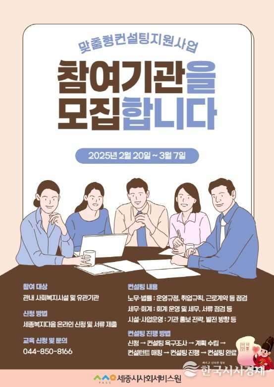 한국시사경제 윤광희 기자 | 세종시사회서비스원(김명희 원장)은 내달 7일까지 관내 사회복지시설을 대상으로 맞춤형컨설팅지원사업 참여기관을 모집한다고 밝혔다.