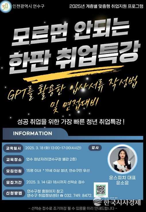 한국시사경제 경제팀 | 연수구는 이달부터 5월까지 구청 별관 연수청년자리에서 취업을 희망하는 구직자를 대상으로 ‘모르면 안 되는 한판 취업 특강’을 무료로 진행한다.