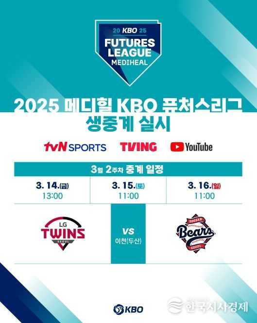 KBO는 14일(금) 개막하는 2025 메디힐 KBO 퓨처스리그 경기를 TV 채널 tvN SPORTS와 OTT 플랫폼 TVING 및 KBO 공식 유튜브 채널을 통해 생중계 한다.