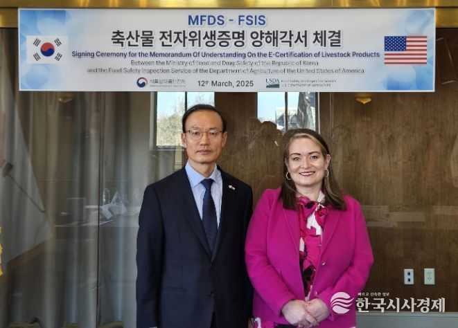 한국시사경제 해외팀 | 식품의약품안전처는 우리나라로 수입되는 미국산 축산물에 대해 수출국(미국) 정부가 발행하는 위생증명서의 디지털 전환을 위한 ‘한-미 수출입 축산물 전자위생증명 협력 양해각서(MOU)’를 미국 식품안전검사청(FSIS)과 3월 13일(현지시간 3월 12일) 미국 워싱턴D.C에서 체결했다고 밝혔다.