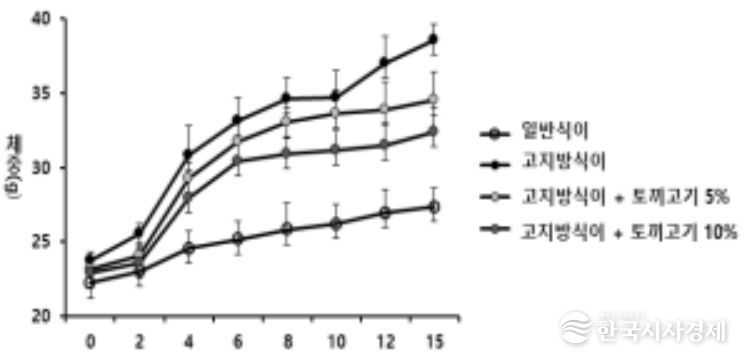 연구 결과, 토끼고기를 포함한 고지방 식이군이 토끼고기를 포함하지 않은 단순 고지방 식이군에 비해 체중 증가가 유의미하게 억제된 것이 확인됐다. 실험 초기(0주)에는 모든 실험군의 체중이 유사한 수준이었으나, 토끼고기를 포함한 고지방 식이군의 체중 증가가 점진적으로 억제됐다. 특히 토끼고기를 10% 포함한 식이군이 5%를 포함한 식이군보다 체중 증가가 더욱 둔화했다.