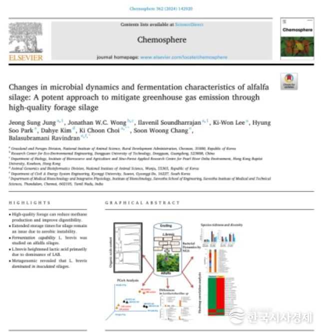 한국시사경제 김숙영 기자 | 농촌진흥청은 알팔파 담근먹이(사일리지) 발효 품질과 저장성을 향상할 수 있는 유산균 첨가제 ‘레빌락토바실러스 브레비스 케이시시(KCC)-44’를 개발하고, 기술이전을 통해 실용화 기반을 마련했다고 밝혔다.
