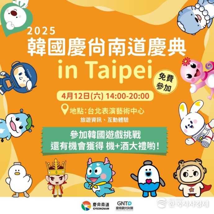 한국시사경제 해외팀 | 경상남도와 경남관광재단은 11일부터 12일까지 이틀간 대만 타이베이에서 10개 시군과 함께 ‘도시군 합동 경남관광홍보 로드쇼’를 개최하고 관광객 유치를 위한 대규모 현지 관광 마케팅을 전개한다고 밝혔다.