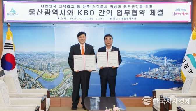 한국시사경제 스포츠팀 | KBO와 울산시(시장 김두겸)는 4월 11일(금) 울산시청에서 KBO 교육리그 정기 개최를 통한 야구 발전 및 지역경제 활성화 업무협약(MOU)을 체결했다.