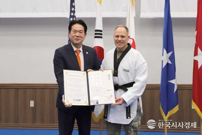 한국시사경제 스포츠팀 | 국기원이 주한 미8군사령관 크리스토퍼 C. 라니브(Christopher C. LaNeve, 중장)에게 명예단증을 수여했다.