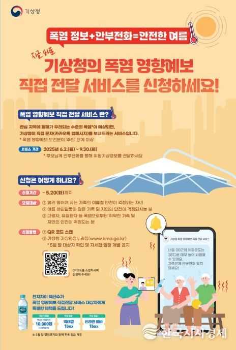 ‘폭염 영향예보 직접 전달 서비스’는 4월 18일부터 5월 20일까지 기상청 기상행정 누리집과 홍보 포스터 큐알(QR)코드를 통해 신청할 수 있으며, 최대 2곳의 관심 지역을 지정할 수 있다. 5월 말에 서비스 대상자가 확정되고, 개별 안내가 진행될 예정이다.