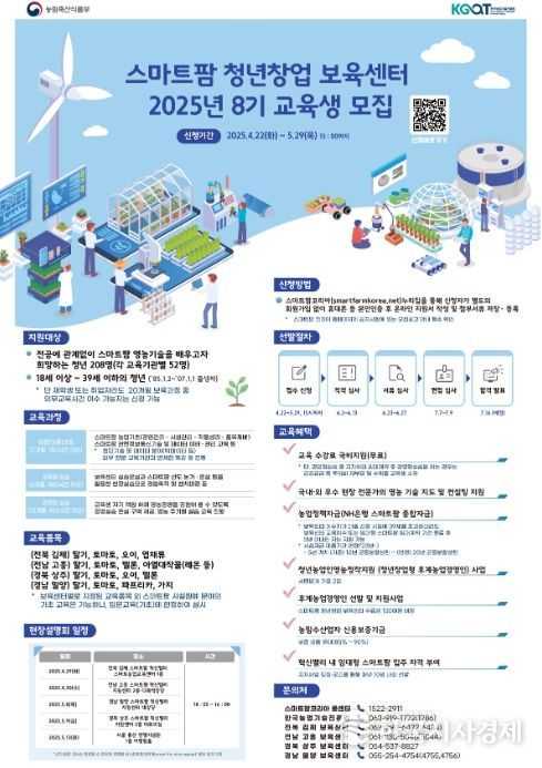 한국시사경제 김숙영 기자 | 농림축산식품부는 오는 4월 22일부터 스마트팜 전문인력 양성을 위해 '스마트팜 청년창업 보육센터'의 2025년 신규 교육생을 모집한다.