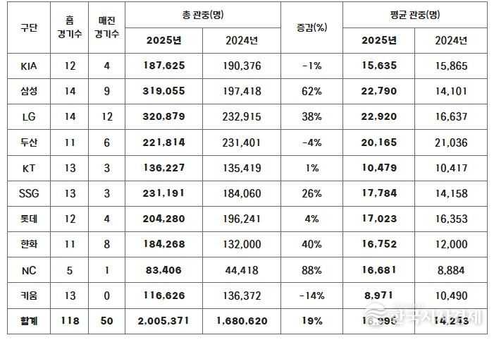 평균 관중 1만 6,995명, 지난해 동 경기 수 대비 19% 증가