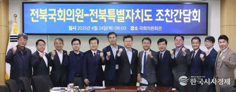 전북특별자치도는 24일 국회의원회관에서 전북 국회의원들과 조찬간담회를 열고 지역 발전을 위한 전략과 공동 대응 방안을 공유했다. 이날 간담회에는 김종훈 경제부지사와 이원택 더불어민주당 전북특별자치도당위원장을 포함한 더불어민주당 전북 국회의원 9명*이 참석했다.
