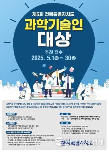 한국시사경제 김숙영 기자 | 전북특별자치도는 도내 과학기술인의 명예와 자긍심을 높이고, 지역 과학기술 발전에 이바지한 유공자를 발굴·격려하기 위해 ‘제5회 전북특별자치도 과학기술인대상’ 수상 후보자를 5월 1일부터 30일까지 공개 모집한다고 밝혔다.