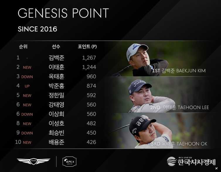 한편 시즌 종료 후 제네시스 포인트 1위로 ‘제네시스 대상’을 차지한 선수에게는 보너스 상금 2억 원과 함께 제네시스 차량, KPGA 투어 시드 5년과 PGA투어 큐스쿨 최종전 직행 자격, DP월드투어 시드 1년이 주어진다.