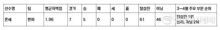 폰세의 3~4월은 압도적이었다. 7경기에 선발 등판해 5승을 기록하며 승리 부문 2위에 올랐다. 4월 9일 잠실 두산 전부터 27일 대전 KT 전까지는 선발 4연승을 기록했고, 한화는 폰세가 3~4월 선발 등판한 경기에서 6승 1패를 기록, 폰세의 활약에 힘입어 상승세를 탈 수 있었다.