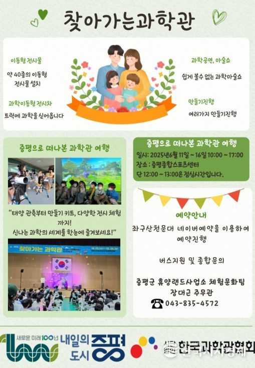 증평군은 오는 6월 11일부터 16일까지 6일간 증평종합스포츠센터에서 ‘찾아가는 과학관’을 운영한다고 밝혔다.