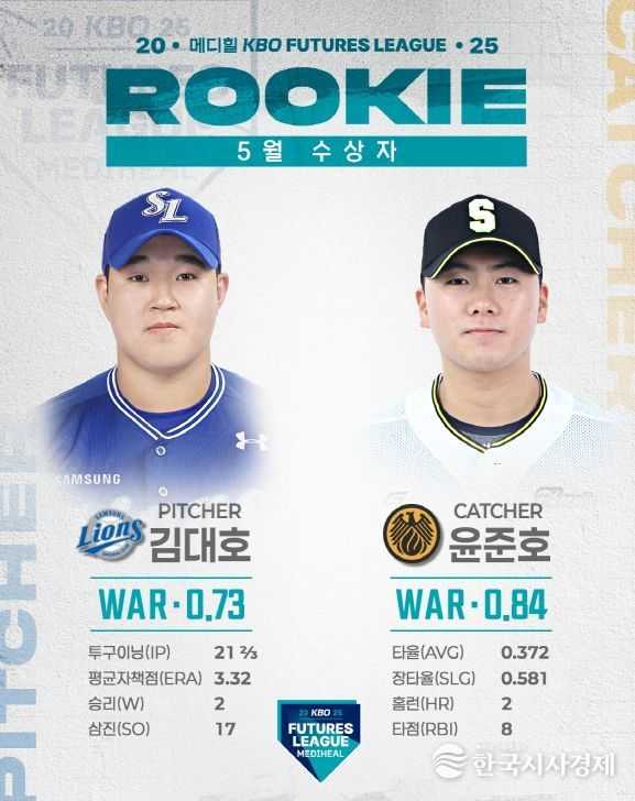 한국시사경제 스포츠팀 | 2025 메디힐 KBO 퓨처스리그의 5월 퓨처스 루키상 수상자로, 투수 부문에는 WAR 0.73을 기록한 삼성 김대호가, 타자 부문에는 WAR 0.84를 기록한 상무 윤준호가 각각 선정됐다.