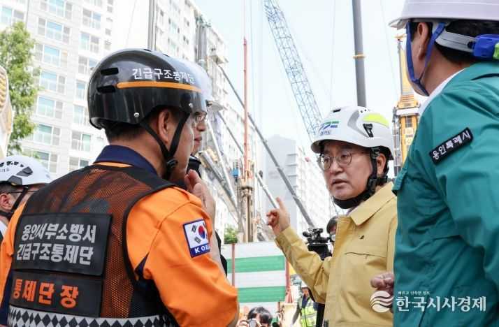 한국시사경제 이정이 기자 | 김동연 경기도지사가 지난 5일 밤 천공기(지반을 뚫는 건설기계) 전도사고가 발생한 용인시 기흥구 서천동 인덕원~동탄 복선전철 공사 현장을 찾아 사고 수습 상황을 점검했다.