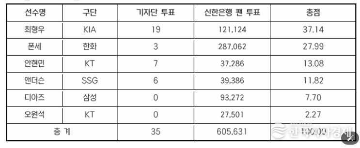 기자단 투표 총 35표 중 19표(54.3%), 팬 투표 60만 5,631표 중 12만 1,124표(20%)로 총점 37.14점을 받은 최형우는 기자단 투표 3표, 팬 투표 28만 7,062표로 총점 27.99점을 기록한 한화 폰세를 제치고 5월 월간 MVP로 선정됐다.