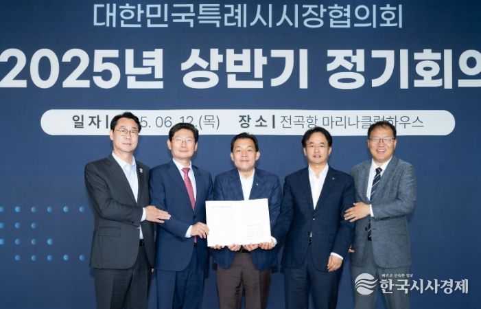 대표회장인 이재준 수원시장을 비롯한 5개 시 특례시장(창원시는 시장 권한대행)은 12일 화성시 전곡항 마리나클럽하우스에서 열린 대한민국특례시시장협의회 2025 상반기 정기회의에서 건의문에 서명했다. 특례시시장협의회는 행정안전부 장관 등에게 건의문을 전달할 예정이다.