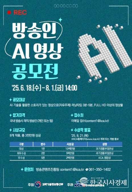 한국시사경제 김숙영 기자 | 과학기술정보통신부와 한국방송통신전파진흥원은 방송 분야의 인공지능 활용 확산을 위해 '방송인 인공지능 영상 공모전'을 6월 18일부터 8월 1일까지 개최한다고 밝혔다.