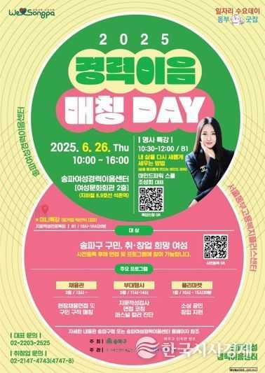 한국시사경제 경제팀 | 서울 송파구가 오는 26일 ‘송파여성경력이음센터’에서 경력단절(보유) 여성 취·창업을 위한 '2025 경력이음매칭데이'를 개최한다.