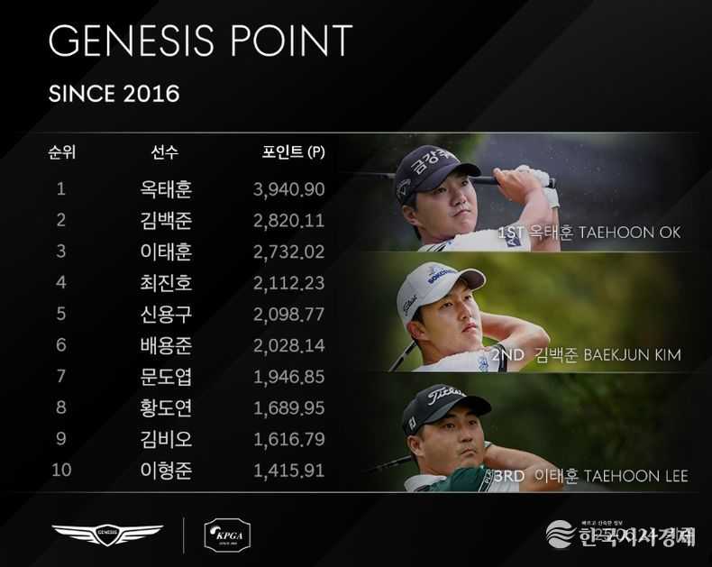 한편 옥태훈과 김백준에 이어 이태훈(35.캐나다)이 3위(2,732.02포인트), 2016~2017년 ‘제네시스 대상’ 수상자 최진호(41.코웰)가 2,112.23포인트로 4위, 신용구(34.금강주택)가 2,098.77포인트로 5위에 안착했다. 배용준(25.CJ)이 6위, 문도엽(34.DB손해보험)이 7위, 황도연(32.Mss)이 8위, 김비오(35.호반건설)가 9위, 2018년 ‘제네시스 대상’의 주인공 이형준(33.웰컴저축은행)이 10위로 TOP10을 형성했다.