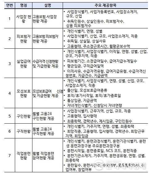 그간 수요가 많았던 ▲고용보험 가입 사업장 현황, ▲고용보험 피보험자 현황, ▲구인‧구직 정보 등 7종(137개 항목)의 핵심 데이터를 중심으로, 데이터 간 결합 분석이 가능하도록 개인 및 사업장 식별키도 포함해 제공된다.