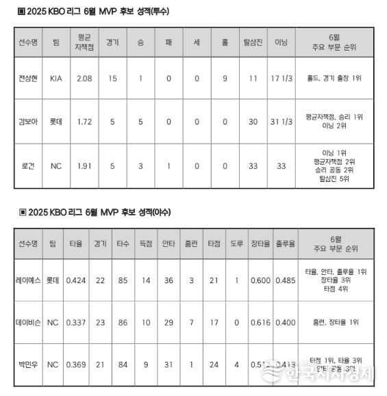 한국시사경제 스포츠팀 | 2025 신한 SOL뱅크 KBO 리그 6월 월간 MVP 후보로 총 6명의 선수가 선정됐다. 투수 중에서는 KIA 전상현, 롯데 감보아, NC 로건, 야수 중에는 롯데 레이예스, NC 데이비슨, 박민우가 6월 월간 MVP 수상을 노린다.