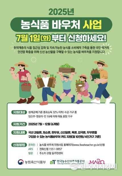 신청 기간은 7월 1일부터 12월 12일까지이며, ▲주민등록 주소지 관할 동주민센터 방문 ▲농식품 바우처 누리집 ▲농식품 바우처 고객지원센터를 통해 가능하다.