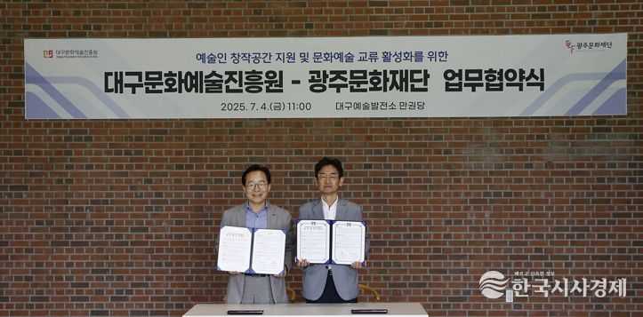 한국시사경제 대구취재본부 | (재)대구문화예술진흥원과 (재)광주문화재단은 예술인 창작공간 지원 및 문화예술 교류 활성화를 위한 업무협약(MOU)을 4일에 체결했다.